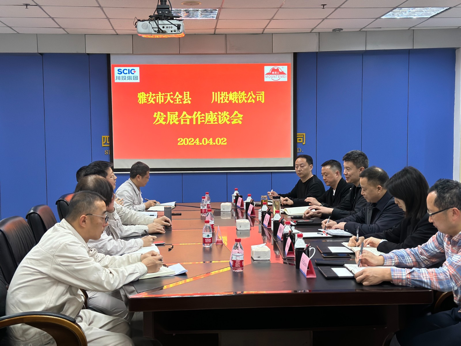 4月2日,雅安市天全縣委常委、常務副縣長余松,副縣長周雅軍一行到川投峨鐵公司再次對接發(fā)展項目。川投峨鐵公司黨委書記、董事長唐華應和黨委委員、副總經(jīng)理丁憲,黨委委員、財務總監(jiān)方玲參加對接交流座談。