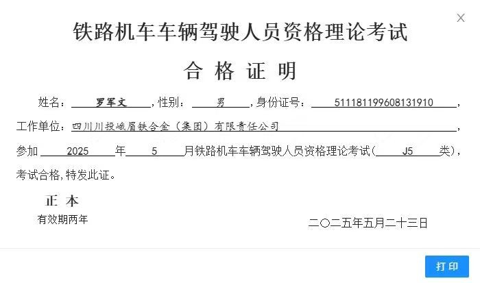 國家鐵路局鐵路機(jī)車車輛駕駛?cè)藛T資格考試作為國家級行業(yè)考試,由國家鐵路局統(tǒng)一組織。在公司的統(tǒng)籌安排和支持下,今年4至5月,該員工全脫產(chǎn)參與了中鐵成都局組織的鐵路機(jī)車車輛駕駛?cè)藛T全封閉式集中培訓(xùn)。培訓(xùn)時長超過40天,在高強(qiáng)度的學(xué)習(xí)任務(wù)與緊張的培訓(xùn)節(jié)奏下,該員工憑借毅力與努力,以扎實(shí)的理論基礎(chǔ)取得了優(yōu)異成績,理論考試兩門科目《安全規(guī)章》和《專業(yè)知識》分別拿下97分和95分的高分,綜合評定成績合格。